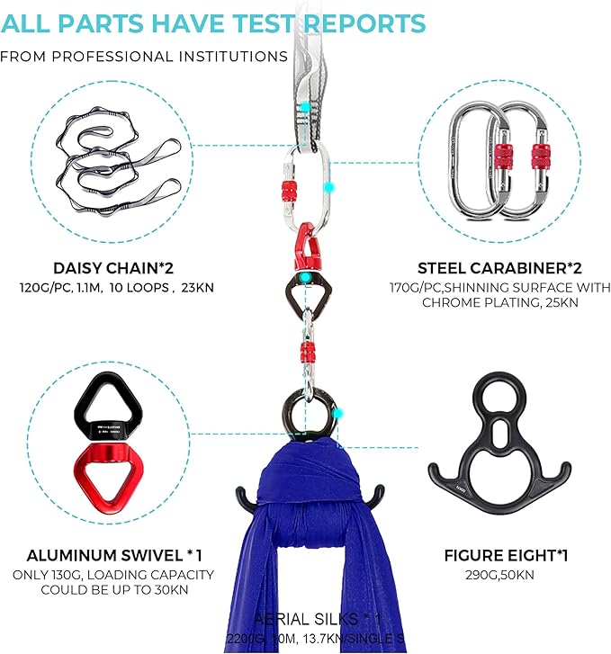 - SILK STYLE - This aerial silk products are made of high-quality materials and well-designed to ensure safety. Our Aerial Silks Kit have undergone strict testing and certification to ensure that there are no safety hazards during use. At the same time, we provide detailed instructions and operation videos to make you feel more at ease when using them.