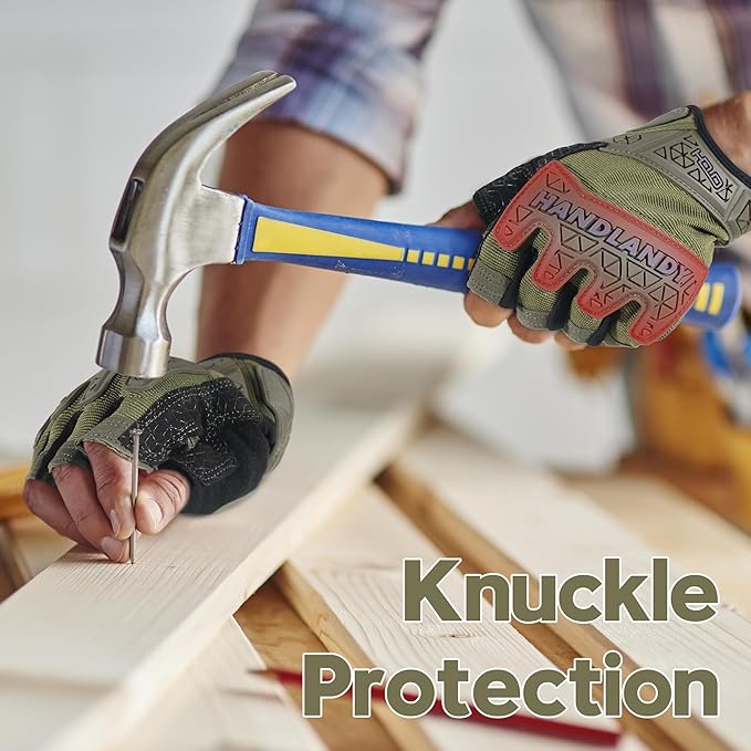 - Flexible Impact Resistant Half finger work gloves: TPR strong knuckle protection keeps your hand safe while working without limiting dexterity, keeps your hands warm while still being protected from scrapes and bruises, and also able to easily use a pen to write or handle small objects. Pull off easy with the built-in tabs along the fingers Concise Sizing Guidance: For optimal fit with our upgraded backhand material, we recommend selecting one size larger than your standard glove size.