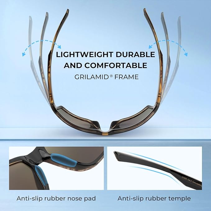 - KEY FEATURES – Polarized lenses reduce glare - Impact resistant TAC lenses protect your eyes from flying objects - Lightweight, durable, and comfortable Grilamid frames – Anti-slip nose and temple pads - Block 100% of the harmful UVA and UVB rays – Full wrap design for maximum protection