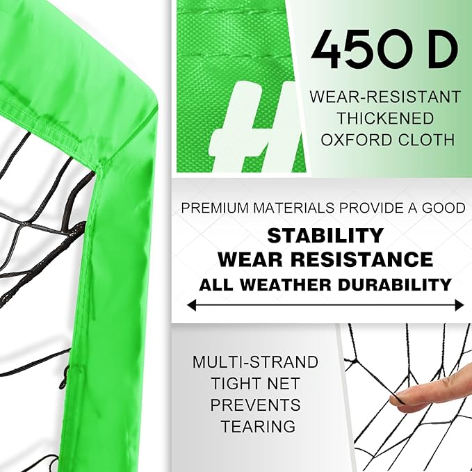 - 【Long-lasting Thickened Material】 The soccer goal is made of 450D thickened oxford cloth, 12mm high elastic fiberglass pole and strong 3-layer polyester soccer net. This ensures exceptional performance even against powerful shots, maintaining its all-weather durability and it won't fade or wear even if it is placed outdoor for a long time.