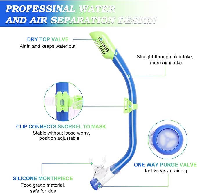 - 【DRY TOP SNORKEL & PURGE VALVE】The Snorkel adopts the most stable dry float valve design. When immersed in water, the top float valve will close automatically to prevent water from entering the breathing tube, the lower purge valve can quickly drain water, so that children will not be choked by water. Food grade soft liquid silicone mouthpiece is durable and safe for children to use.