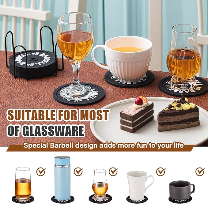 - Eye Catching And Inventive Design: the barbell coasters with astonishing gym inspired pattern enhances the aesthetics of your living space, the regular coaster design has been revamped with an ingenious barbell plate design, which is a nice but perfect gym decoration