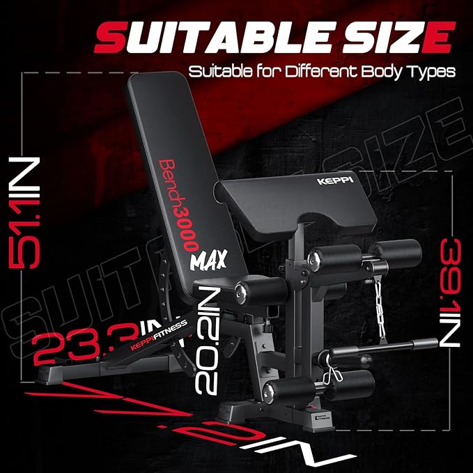 KeppiFitness Adjustable Weight Bench, Bench3000 MAX Heavy Duty Workout Bench Press with Leg Extension and Preacher Pad for Home Gym Fitness, Flat Incline Decline Sit Up Bench