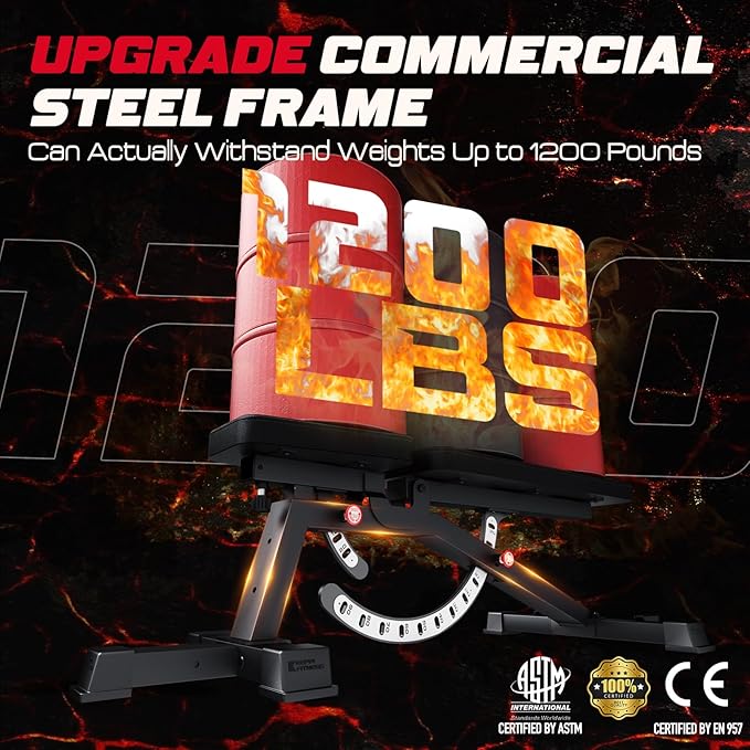 - Upgraded Multi Functional Weight Bench - With a weight capacity of 1200 lbs. The frame of weight bench is made of 2.7”*1.9” commercial thickness steel to ensure safety and durability during high intensity workouts.