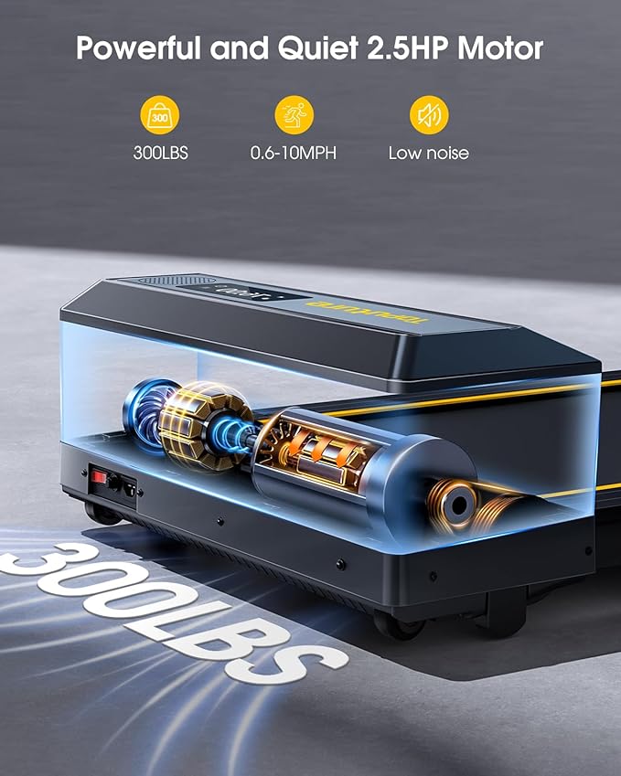 - 🏃♀️【2.5HP POWERFUL LOW NOISE MOTOR】This walking pad treadmill is equipped with a powerful 2.5HP motor and it can provide a load-bearing weight capacity of up to 300lbs. With the shock absorption design, you can use this quiet treadmill to exercise at home, apartment or in the office without disturbing anyone.