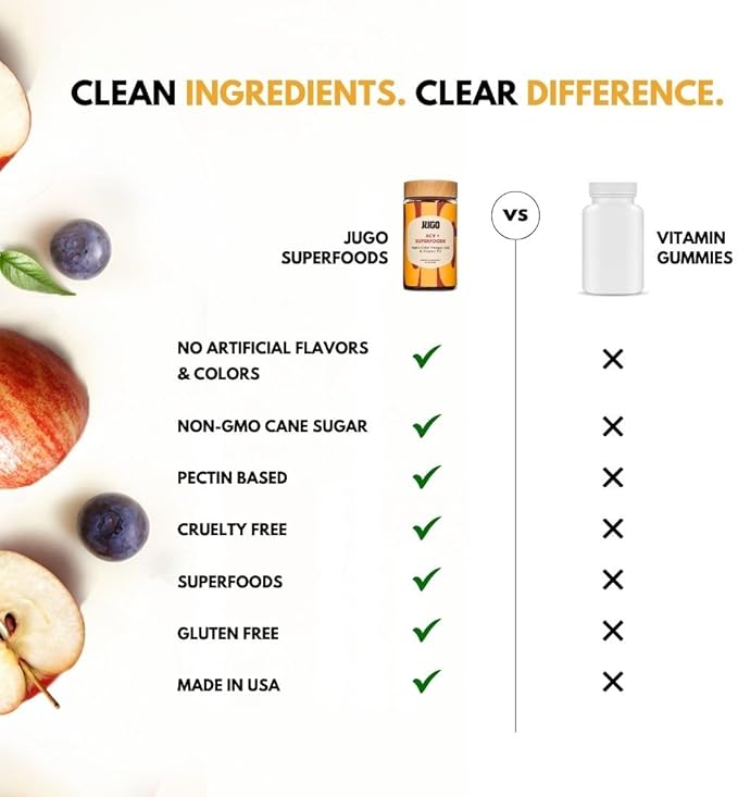 JUGO Apple Cider Vinegar + SUPERFOODS | ACV Gummies with Vitamin B12 & Acai | 40 Count Digestive Support Gummies | Plant-Based, Gelatin- Free, Non-GMO, Made in USA