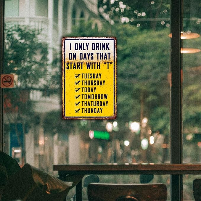 - Funny Bar Tin Signs, Size : 8 x12inch (20 x30cm). The bar metal sign reads: I Only Drink On Days That Start With T.