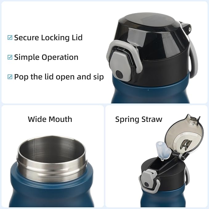 - Equipped with a lockable flip lid and a spring straw, the bottle is leak-proof,left it in your bag without worrying any spills. Simple operation design ensures you Just pop the lid open and sip.Soft silicone spout makes a nice drinking experience.