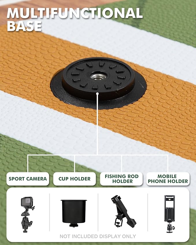 - 【Multifunctional base】The paddleboard multifunctional base can meet various needs. When you are traveling, you can install a cup holder so that you can replenish water anytime and anywhere without stopping, sitting down, opening your package, and so on. When you go out fishing, you can install a fishing rod bracket, place your fishing rod, or place your fish detector. When you want to record your wonderful moments of playing, you can install your sports camera or your phone holder, etc.