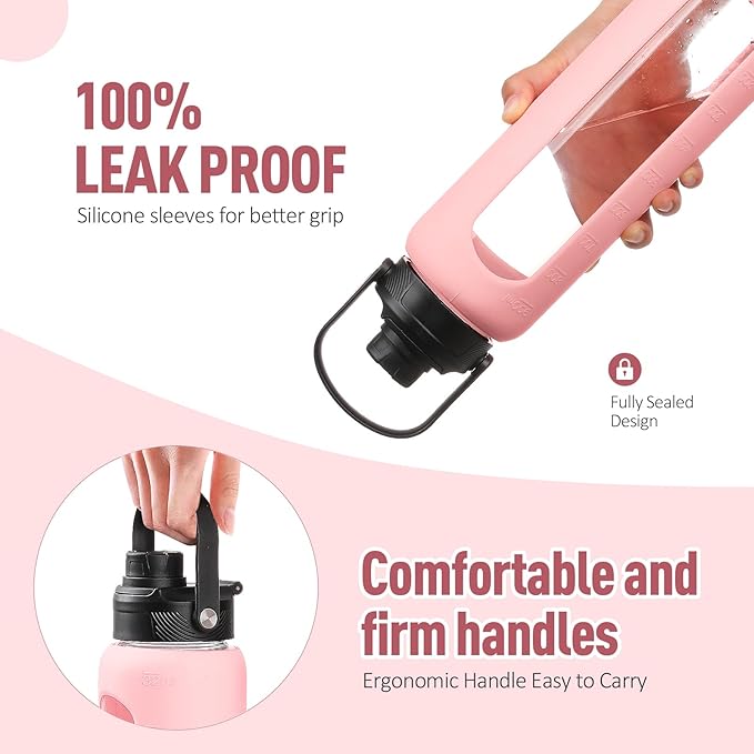- WHAT YOU'LL GET - Our daily water intake bottle set comes with a water bottle covered with a silicone protective sleeve, 1 bamboo lid plus 1 spout lid with handle, 2 straws(1 stainless steel and 1 tritan), and 1 straw cleaning brush. You can switch between the two lids according to the occasion and preferences. If there is any problem with your water bottle glass or the lid is damaged within 6 months, you can contact us at any time for a replacement.