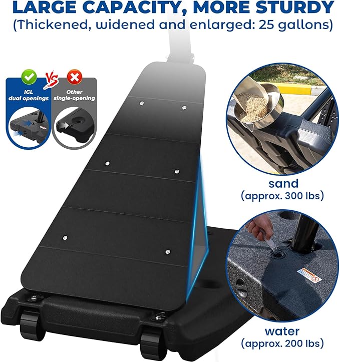 • 50 Inch Stable Base: The base dimensions measure 50 inches, with a filling capacity of 25 gallons (300 lb sand & 200 lb water). This provides a solid foundation, ensuring the basketball hoop remains steady and stable during use