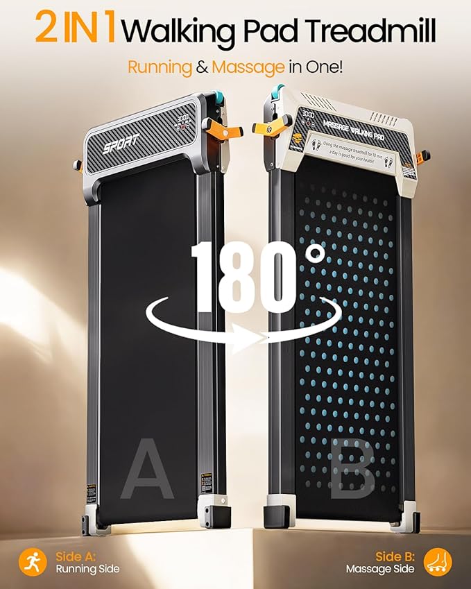 - Dual-Function Treadmill: Walking pad treadmill can be used on both sides. Side-A walking pad with incline. Side-B treadmill with foot massage. After you finish your running workout, our treadmill effectively relieves fatigue and muscle tension, alleviates foot soreness, and provides a soothing massage effect for relaxation