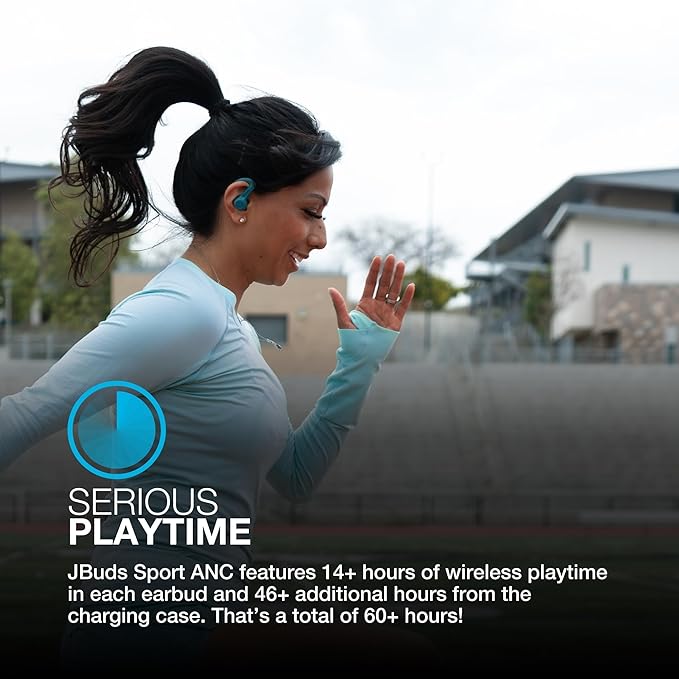 - SERIOUS PLAYTIME: JBuds Sport ANC features 14+ hours of wireless playtime in each earbud and 46+ additional hours from the charging case. Thatβs 60+ total hours of Bluetooth playtime!