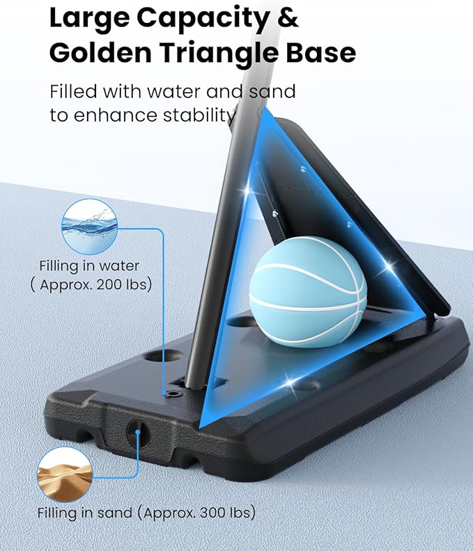- 【50-inch Stable Base】 The base dimensions measure 50 inches, with a filling capacity of 25 gallons (300lb sand + 200lb water). This provides a solid foundation, ensuring the basketball hoop remains steady and stable during use