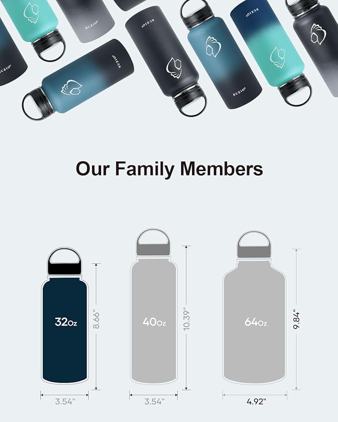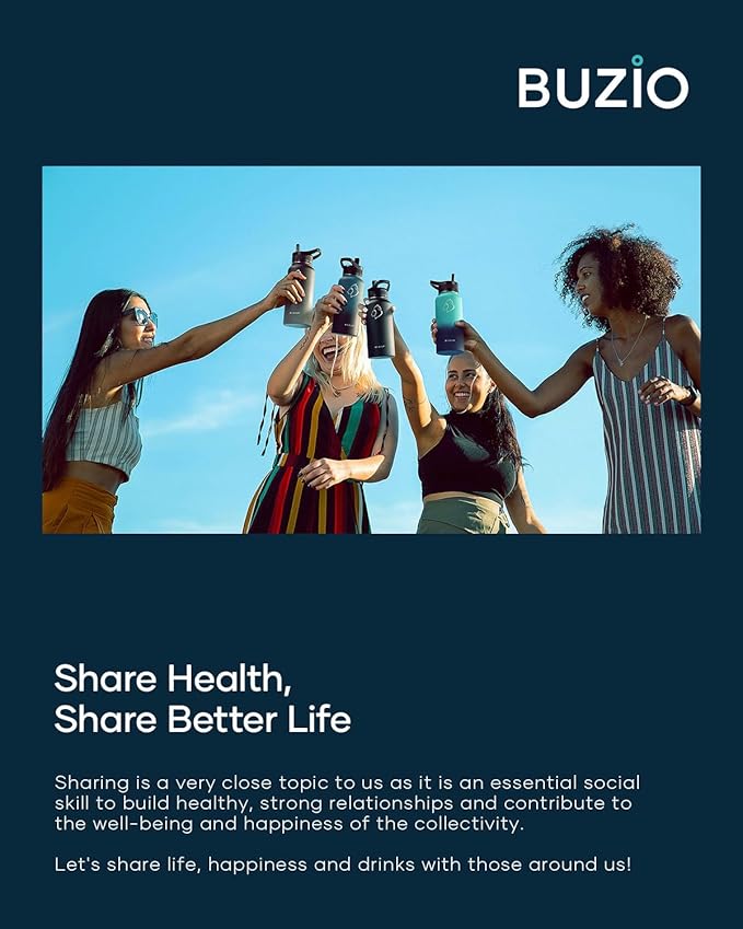• There is Always One for you: BUZIO insulated water bottle meets your imagination in all aspects of drinking, from the comprehensive sizes (32oz-64oz) to classical and stylish designs, from the production materials to convenient accessories. Come to BUZIO, there is always one for you.
