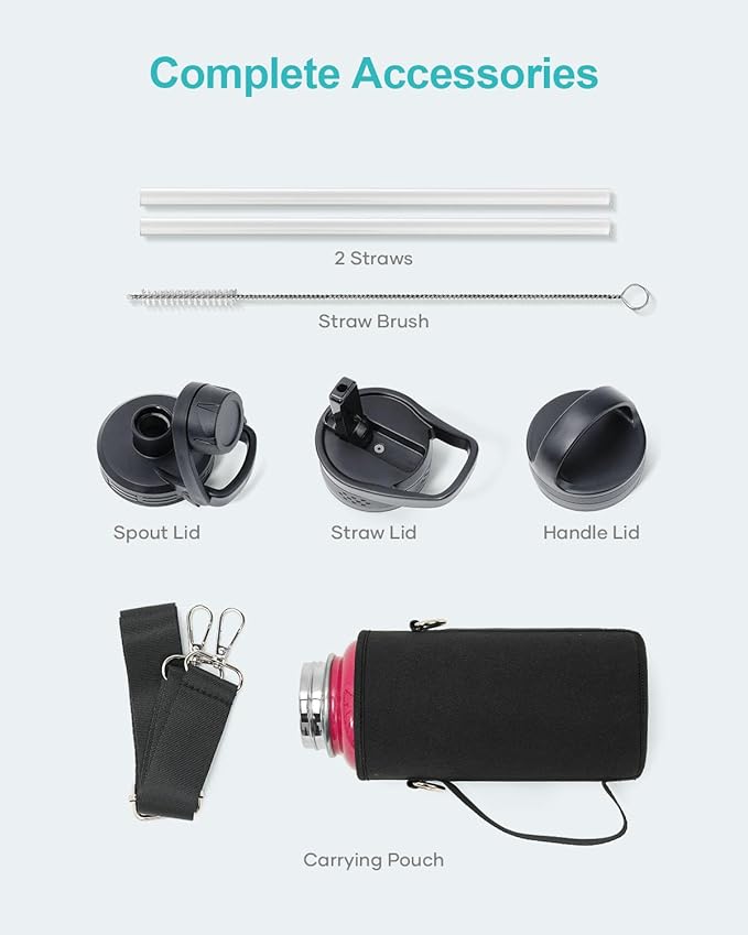 • Super Deal Combo: Buy 32oz insulated water bottle, get 7 accessories. The pack includes 1 x carrying pouch, 3 x lids, 2 x straws, and 1 x straw cleaner. This bottle is ideal for camping, hiking, cycling, running, gym sessions, or outdoor work, ensuring you stay hydrated wherever you go.