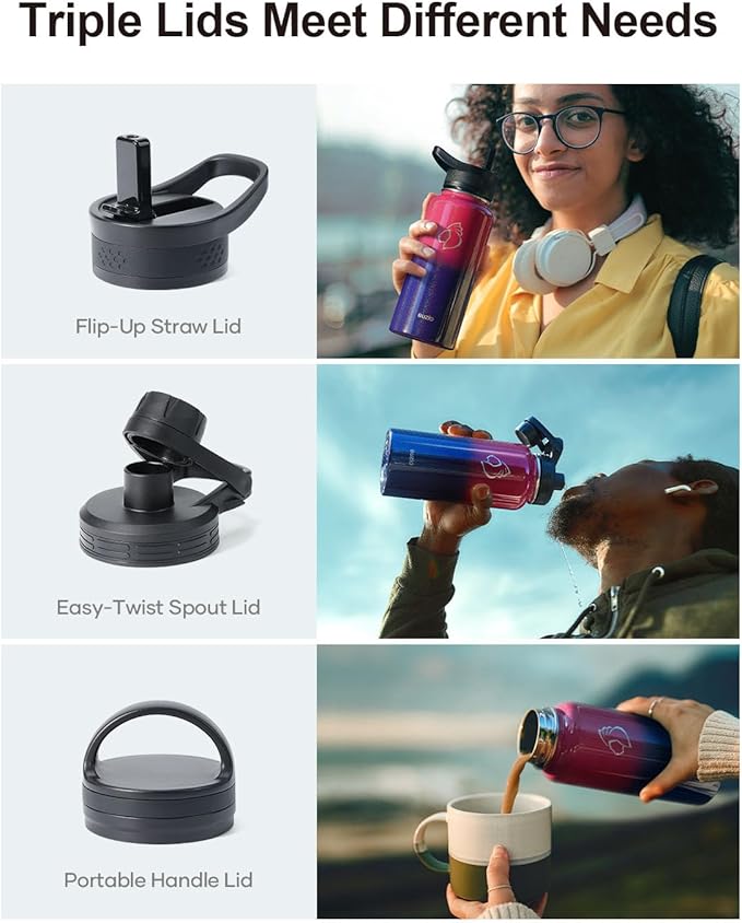 • 3 Caps Pack, 100% Leak-Proof: BUZIO stainless steel water bottle comes with 3 lids: portable handle lid, easy-twist spout lid, and flip-up straw lid to meet camping, hiking, cycling, fitness sports and more. Each lid has a thickened 360° seal for 100% leak-proof.