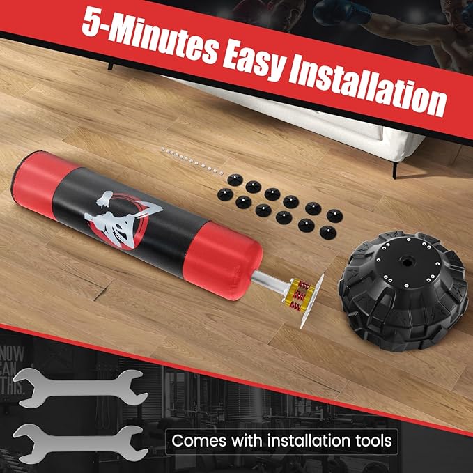 - 【3-Step Assembly】The installation of this martial punching bag is easy peasy lemon squeezy with only 3 step: 1.screw the 12 suction cups; 2.add water or sand to the base; 3. align the heavy bag to the base and fix with screws.
