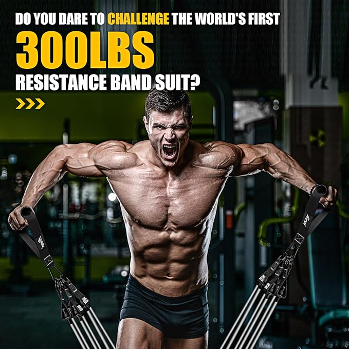 - 【Further Upgraded 420LBS bands】To meet the needs of fitness enthusiasts for strength training. THE WORLD'S FIRST 420LBS RESISTANCE BAND SUIT HAS COME OUT! A real man's resistance band suit, it's here, do you dare to challenge it? The fitness bands can reach up to 420 pounds with 6 different resistance levels(45lbs, 55lbs, 65lbs, 75lbs, 85lbs, 95lbs). You can freely combine our resistance bands according to your strength!