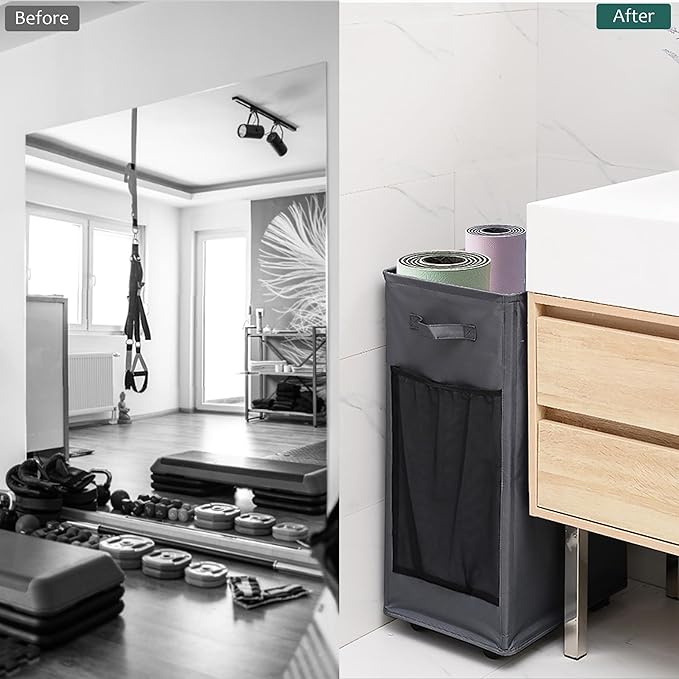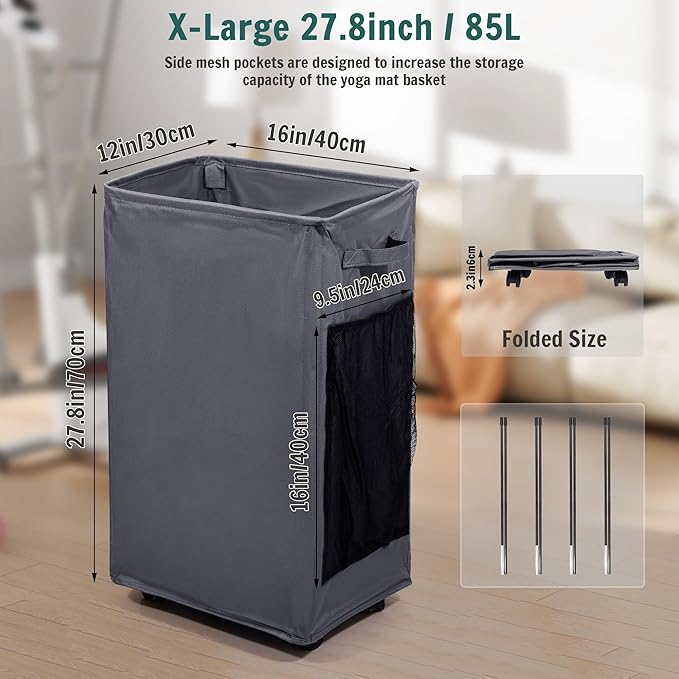 - WIDENED SIZE: Upgraded yoga mat basket with 85L capacity measures 16"(L) x 12"(W) x 27.8"(H) / 41x30x70CM can easily accommodate 4 different sizes of yoga mats, 2 foam rollers, as well as kettlebells, yoga bricks and more
