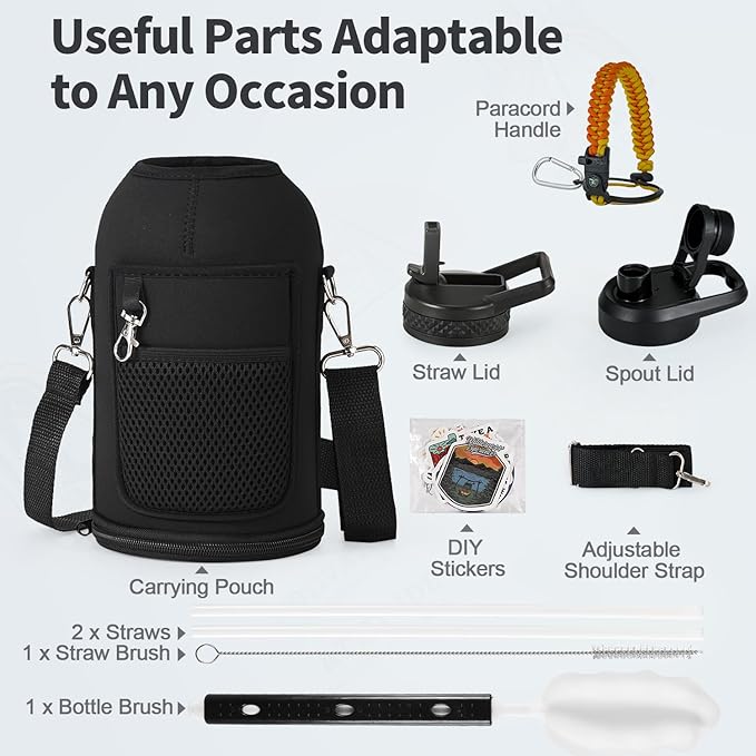 - After Services and Package: We offer continuous after-sales service against leakage and poor cold/hot-keeping capability, we are committed to 100% customer satisfaction. Your purchase includes: WixByti 64oz Water Bottle, Carrying Pouch with Adjustable Strap, Straw Lid with 2 Straws & 1 Straw Brush, Spout Lid, Paracord Handle, Water Bottle Stickers