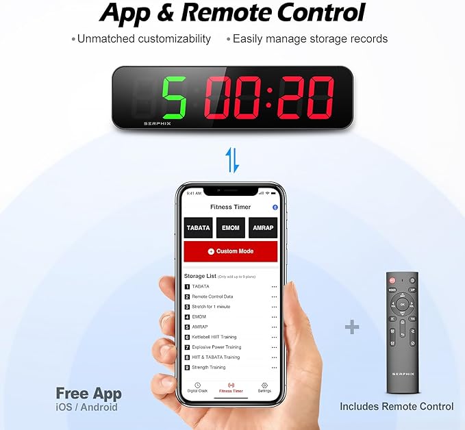 - 【Rich Customization】You can freely configure every parameter of the timing program through the app, as well as add or delete rest and work modules, easily realizing all your ideas. Timing modes include Custom Intervals (P1-P9), Tabata, EMOM, AMRAP, Count Down & Up, and Stopwatch.