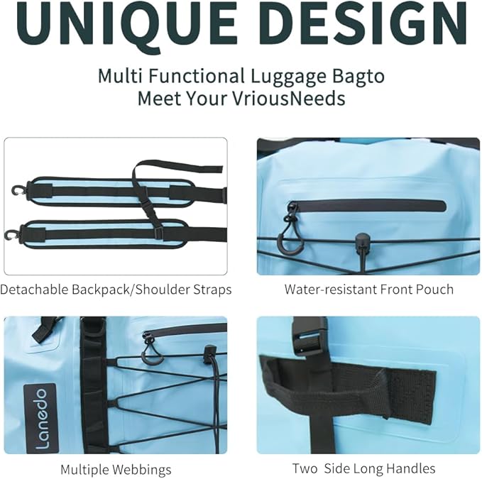 - MULTIPLE APPLICATION-- LANEDO marine dry bag 80L is suitable for water sports like kayaking and paddle boarding, it is not only as waterproof duffle bags for boating, but also fishing, diving, motorcycle trips, hiking, and other outdoor activities