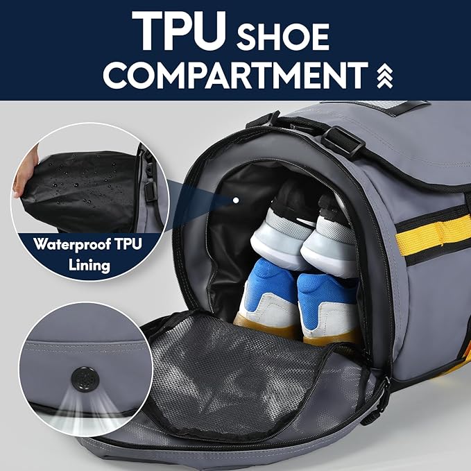 - LARGE CAPACITY TRAVEL DUFFLE: The main compartment with multiple pockets to meet your needs for sports or travel. One large zippered mesh pocket under the open flap to store small items or computers. Outside of the bag with 1 zippered front pocket for storing your personal items. The separate shoe compartment has 1 zippered mesh pocket and 1 ventilation hole