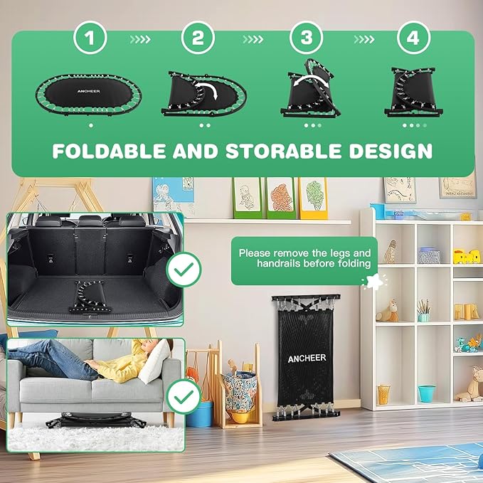 - Easy to Assemble & Foldable Design: 90% of the trampoline body is pre-installed and comes with detailed instructions and installation videos, allowing for quick installation in 20 minutes. The indoor trampoline for kids features a foldable frame design that reduces its size to just 1/3 (4.7 inches) of the original volume for easy storage, with a detachable folding mechanism that requires disassembly for compact storage.