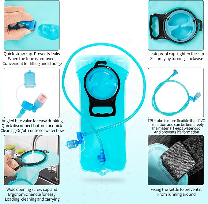 - 【Professional 2L Water Bag】: LASUK Hydration Backpack is an extra large 2L water bag made of TPU material, BPA-free and odorless. The fabric is easy to clean and add ice cubes. The 360-degree rotatable nozzle is convenient for front placement. The on/off valve helps to regulate the water flow. The large capacity of 2L ensures sufficient water supply during a full day of intense hiking/outdoor sports/hunting