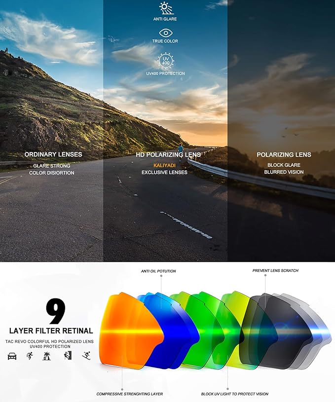 - Outdoor Activity Partner: KALIYADI polarized sunglasses men sports are designed to meet all sports needs due to the ultra lightweight frame design and anti slip design that allows you to experience versatility. Whether you're running, cycling, fishing, traveling, or driving, these running sunglasses provide ultimate protection. The sunglasses men polarized are designed with high-definition durable materials and provide complete UV protection, making them an ideal companion for any exercise.