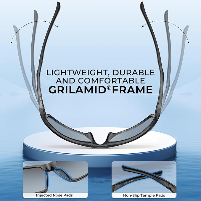 - KEY FEATURES – Impact-resistant polarized 1.0mm TAC lenses reduce glare, Block 100% of harmful UVA and UVB rays, Oleophobic and saltwater resistant lens coatings protect mirror finish, Full wrap frame design, Lightweight, durable, and comfortable Grilamid frames, Non-slip temple pads.