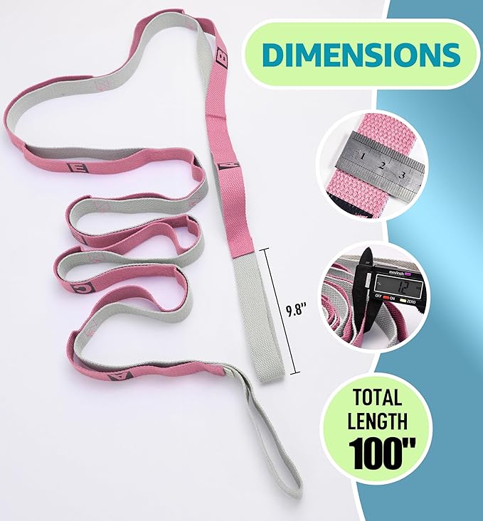 • 14 Independent Loops for Versatile Use: Featuring 14 independent loops, this strap offers unparalleled versatility for all your stretching needs. Easily adjust your grip to target different muscle groups, enhance your yoga poses, or assist in physical therapy exercises. The loops are designed to accommodate all hand sizes, ensuring a comfortable and secure hold, making it perfect for yoga, Pilates, and physical therapy.