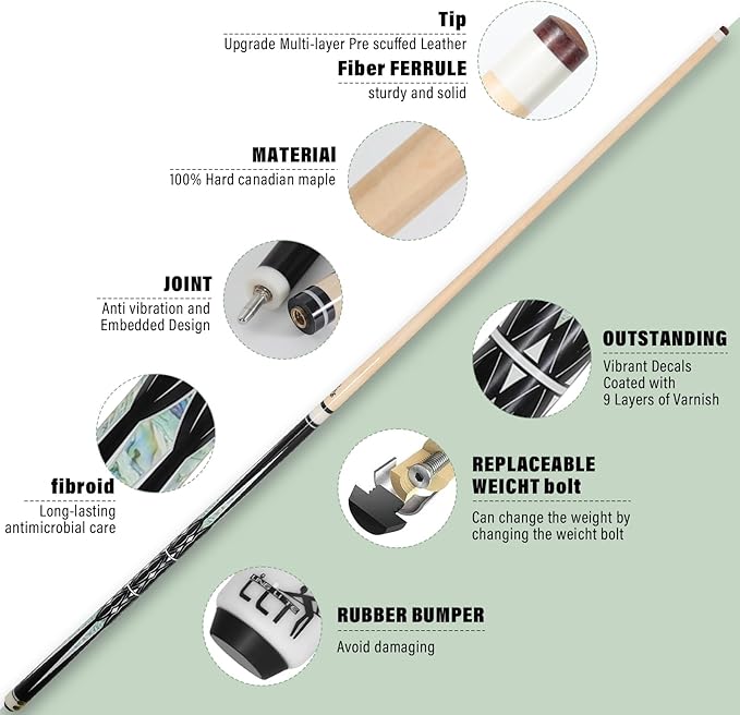 - Maple Construction: Crafted from high-quality maple wood, this cue stick delivers a smooth and responsive feel during gameplay.