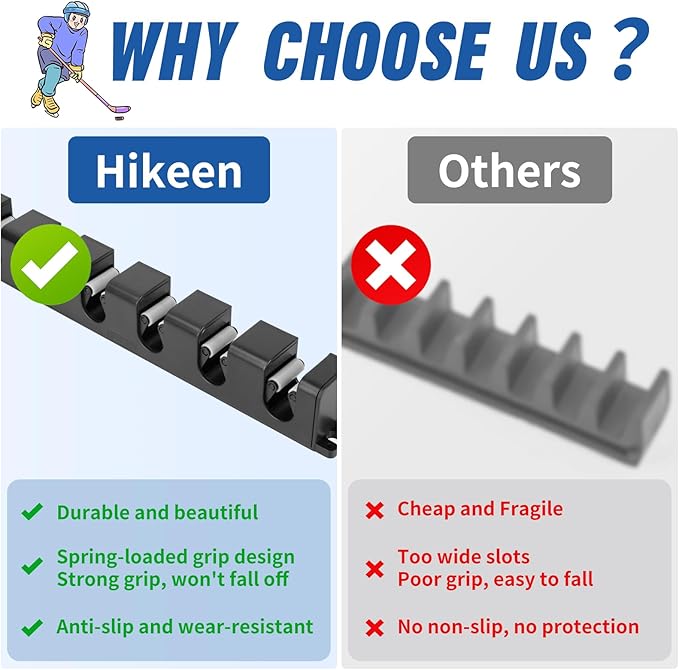 - [SECURE - STABLE CLAMPING] Hikeen Hockey stick wall mount features unique spring loaded grooved rollers and non-slip rubber construction for strong clamping force and non-slip function to securely hold your hockey stick, unlike other grooves on the market that are too wide and easy to fall off. Say goodbye to the worry of hockey stick slipping and damage, safely protect your valuable hockey stick.