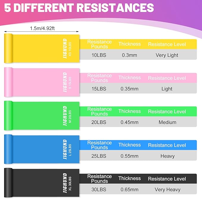 - 【5 Resistance Levels】Workout bands are divided into 5 different levels of resistance: yellow band (XS-10lbs, 0.3 mm); pink band (S-15lbs, 0.35mm); green band (M-20lbs, 0.45mm); blue band (L-25lbs, 0.55mm); black band (XL-30lbs, 0.65mm). You can switch at any time according to your preferences. Please check the size carefully before purchasing.
