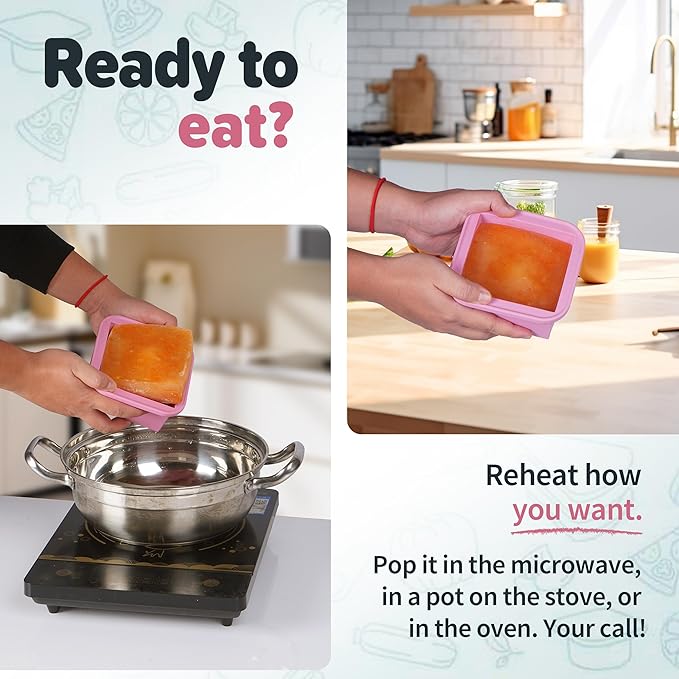 - VERSATILE & CONVENIENT FOR ANY KITCHEN TASK Use them for: Freezing homemade soups, sauces, and broths Storing baby food and portioning snacks Baking (up to 415°F without the lid) Making ice cubes, chocolates, and more! Dishwasher-safe for quick and easy cleaning, they save you time in the kitchen.