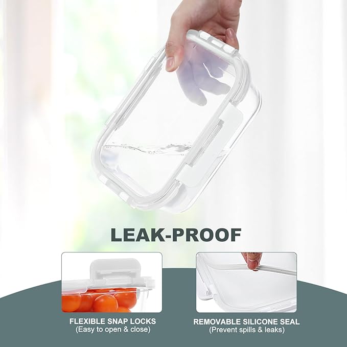 10 Pack Glass Food Storage Containers, Meal Prep Containers with Lids, Airtight Glass Lunch Boxes, Freezer, Oven, and Microwave Safe, White