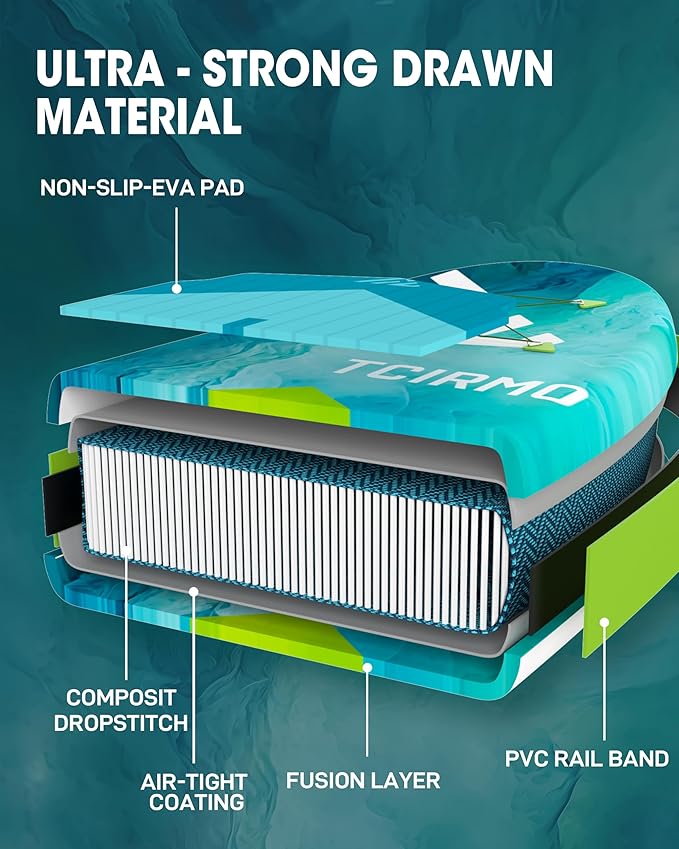 - 【WELDED RAIL TECHNOLOGY】: The Heat-Welded Rail Technology creates a completely airtight, mechanically bonded seam without the risk of glue weakening over time. This makes inflatable paddle board stronger and longer lasting.