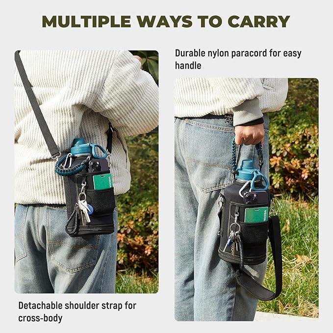 - Iconic Paracord Handle and Carrying Pouch: This insulated water bottle comes with a beautiful hand knit nylon paracord in coordinated color with the water bottle. This paracord handle is a must-have as a full functional camping / hiking flask. And storage carrying pouch with removable shoulder strap for convenient hands free carrying! The safe zippered pocket design to stores all your stuff, holds your cards & phone & key