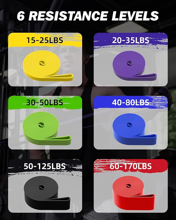 - 【Diverse Resistance Levels】: Explore our Pull Up Resistance Bands with 6 different color-coded bands, offering a distinct exercise bands resistance level: Purple (15-25 lbs), Cyan (20-35 lbs), Yellow (30-50 lbs), Orange (40-80 lbs), Red (50-125 lbs), and Green (60-170 lbs). Customize your workout by using a single band or combining multiple for increased challenge. Designed for individuals weighing 90 lbs to 300+ lbs
