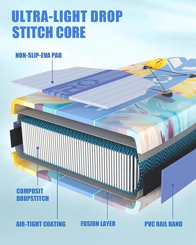 - 【More Paddle Board Accessories】We include all the accessories in our package. Our premium iSUP accessories include the super wide paddle board, pump, adjustable paddle floating, 3 removable paddle board fins, ankle leash, travel waterproof backpack, cell waterproof waist bag, 1 valve wrench, instruction manual.