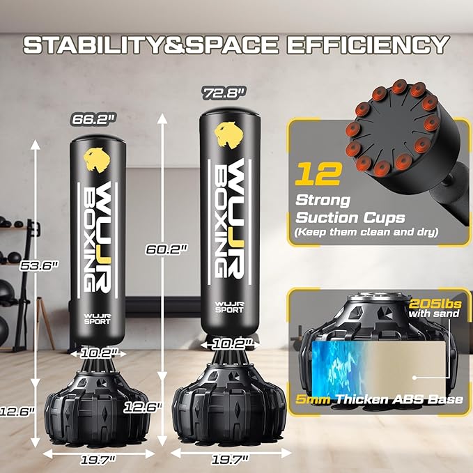 - Stable Sucking Base : 5MM thicken ABS round base with 12 strong suction cups help keep the bag in place on smoonth and even floors. When filled with sand, the base weighs up to 205lbs, ensuring maximum stability during your workouts;