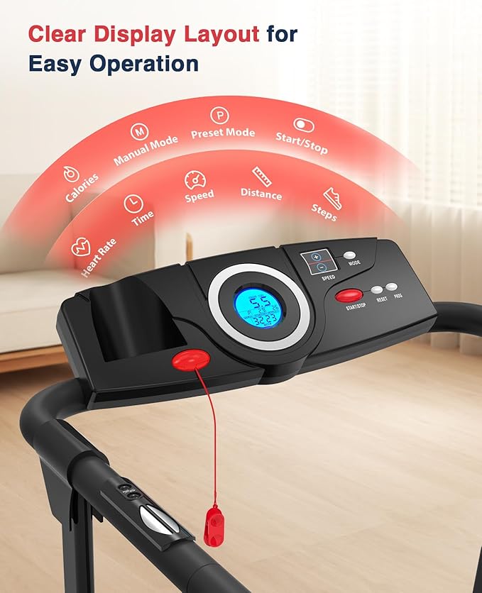 - 【Easy to Operate LED Display】- The Redliro treadmill for seniors features a multi-function LED display, allowing you to easily track time, speed, distance, and calories at a glance. With 12 preset programs and 3 control modes, it helps achieve diverse training goals. Additional features include a cup holder, mobile phone holder, magnetic safety key, and supportive handle bars, ensuring a convenient and enjoyable workout experience.