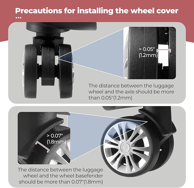 - [Fits Most Suitcases] These suitcase covers for luggage wheel are suitable for suitcases with wheel diameter between 2.0-2.4"(50-60mm),the distance between the luggage wheel and wheel base fender should be more than 0.07"(1.8mm),and the distance between the luggage wheel and axle should be more than 0.05"(1.2mm) ,This Suitcase wheel cover for luggage Suitable for 4x2 double wheels, not suitable for 4x1 single wheels luggage