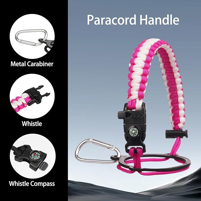 - Suitable for all occasions: This insulated water bottle comes with a beautiful hand-woven nylon paracord, and the paracord handle is equipped with a compass and carabiner and a whistle. It is a fully functional essential water bottle for camping, climbing, hiking, home use, travel, cycling, swimming fitness, and commuting