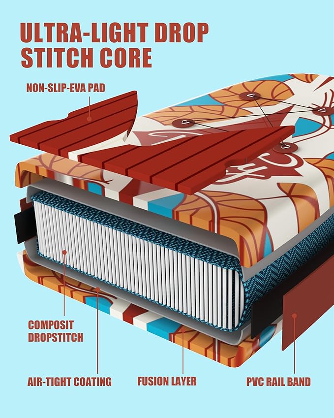 - 【Military Grade High Quality Material】Made of the highest quality military grade material. Soft anti-slip EVA deck pad greatly improved stability and safety while standing. Great family SUP - high weight capacity yet lightweight construction makes it easy for kids to carry, paddle, or ride along as passengers.
