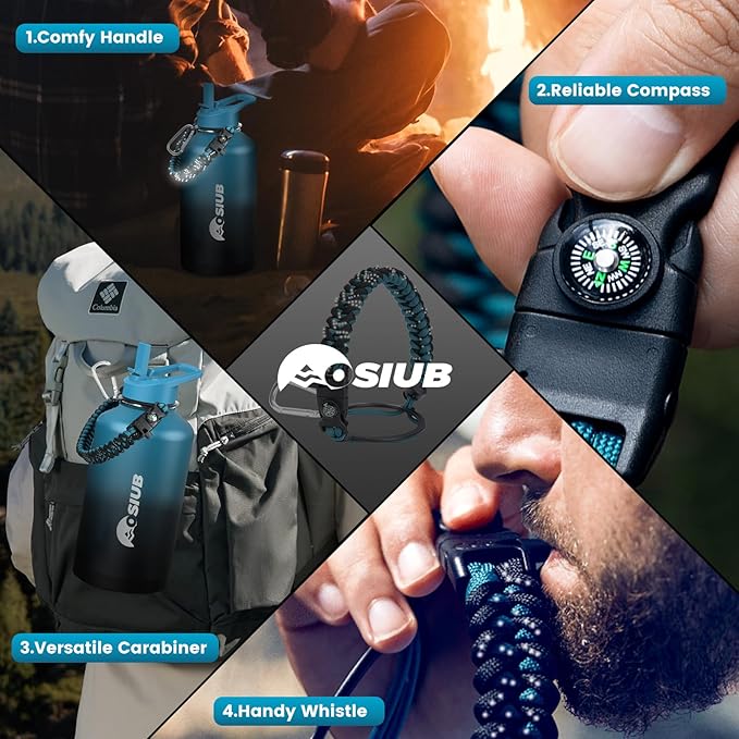 - Nighttime Navigation: Not only does the paracord handle securely grip your insulated water bottle, but it also boasts a glow-in-the-dark feature. Complete with a compass and carabiner, this multifunctional paracord handle is an essential companion for your camping or hiking adventures.