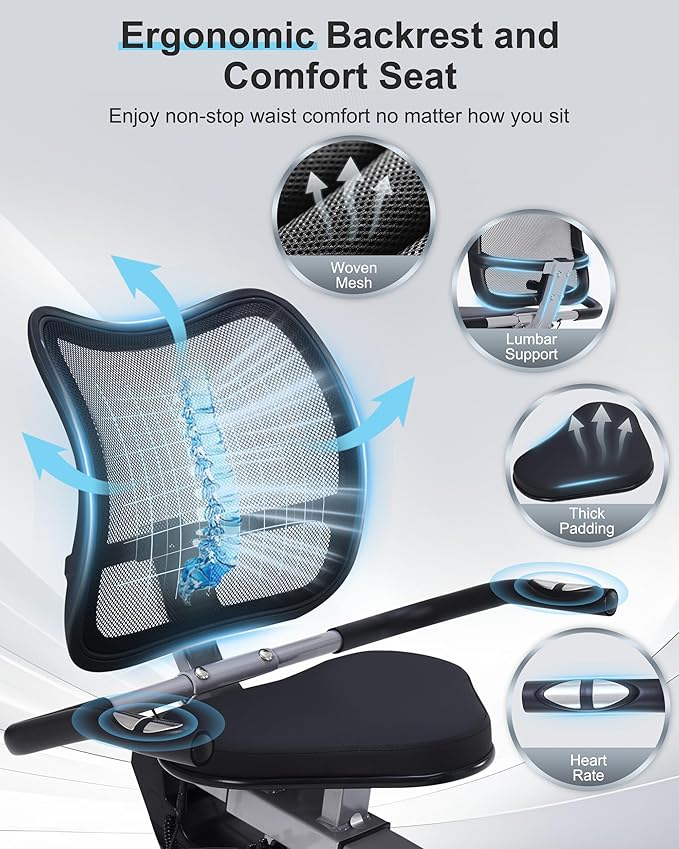 • 【Adjustable Comfort Seat and Ergonomic Backrest】Our recombinant exercise bike features an infinitely adjustable seat position,allowing you to easily tailor the seat to your unique needs. The breathable mesh backrest significantly boosts airflow and is ergonomically designed to ensure continuous lumbar comfort.