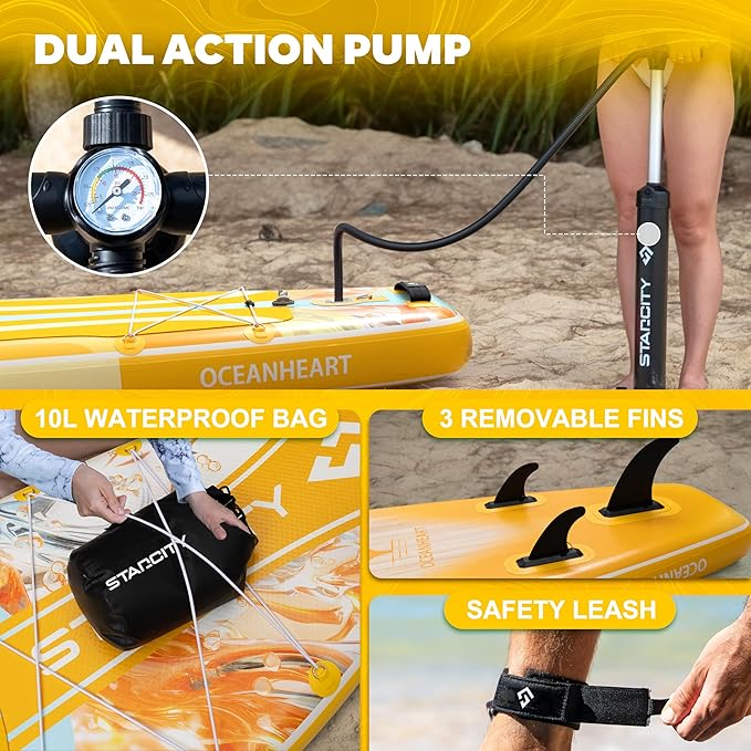 - 【Multi functional application with complete accessories】STARCITY paddle boards for adults are not only suitable for surfing but also perfect for various water activities such as yoga, snorkeling, and fishing. Including a double-action pump, a 4-piece kayak paddle (made from special materials that allow it to float in water and perform well in various aquatic environments), a safety leash, a waterproof bag, three removable fins, and detailed instructions.